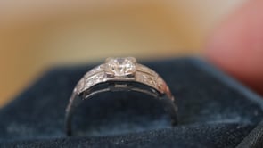 A charmer from the Jazz Age, this glittering Art Déco engagement ring has a .41 carat, I color, VS2 clarity transitional round brilliant cut diamond set with soft fishtail prongs. Two rows of bead set single cut diamonds are in in tapered rectangular shaped frames with millegrain edges. Exquisite floral engraving trails down the sides of this gently curved ring. Made by hand in America in the 1920s. Platinum and currently a size 5, and may be resized.