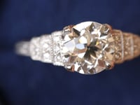 The center Old European Cut Diamond weighs 1.17 carats, K color and SI1 clarity with GIA Report #6224558392. This white facing diamond is set low in a 4 prong platinum ring with step-down shoulders. The step have ten round diamonds bead-set with millegrained egdes. The side diamonds add an additional .10 carats and are G color and VS clarity. This beautiful ring is an exact replica of an original vintage Art Deco engagement ring. Currently size 4 and can be resized.