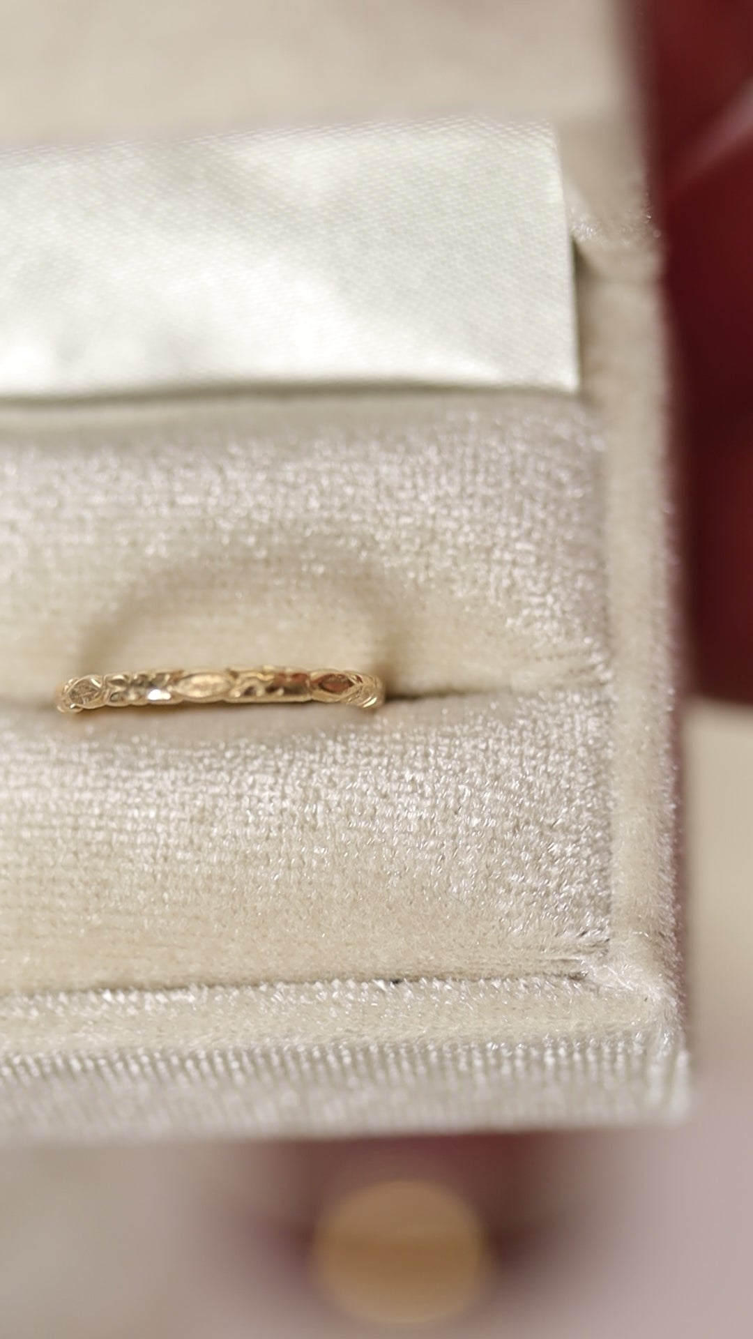 Our Replica of an Art Nouveau Era Wedding band. This lovely floral patterned band measures 1.9 - 2.05 mm wide and is an exact reproduction of an original from the early 20th century. This romantic band pairs well with many styles of engagement rings and has a low profile. With its pretty design, it can be worn on its own as well. Please call for pricing in sizes over 8.