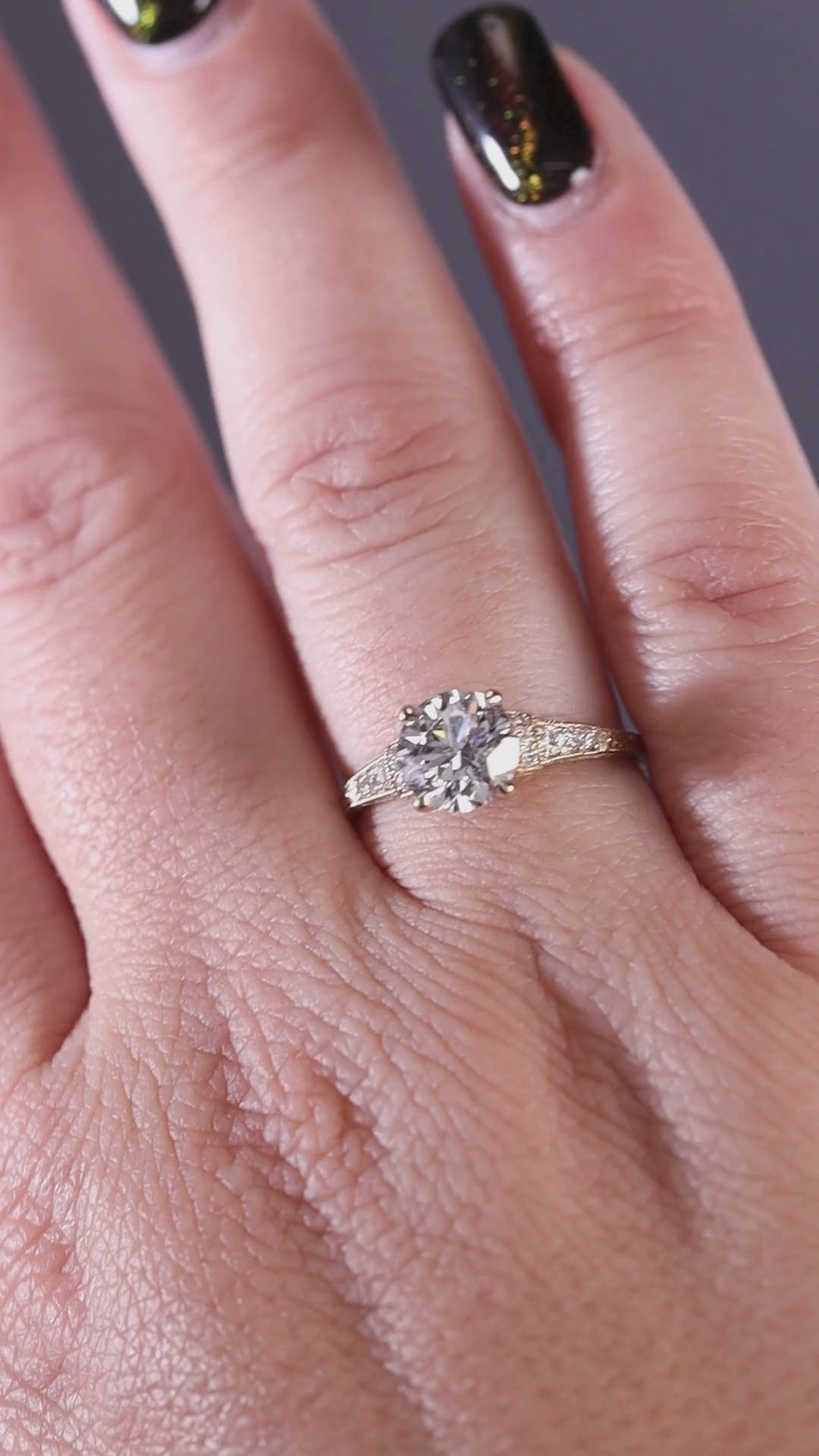This romantic engagement ring is a replica of an antique original from the Art Déco era. Set with a fiery 1.50 ct Round Brilliant cut lab grown diamond. Graded as D/VS2 with an IGI certificate (LG78547951). The very high color center stone is set with eagle talon prongs in this beautiful 14k yellow gold ring. Bead set diamonds flow across the epaulets on either side of the main stone and down the shoulders adding an additional .12 carat total diamond weight. Exquisitely detailed engraving adorns the front, back and top of the shoulders and shank, which is done by hand by our incredibly talented engraver. Size 6.25 and can be resized.