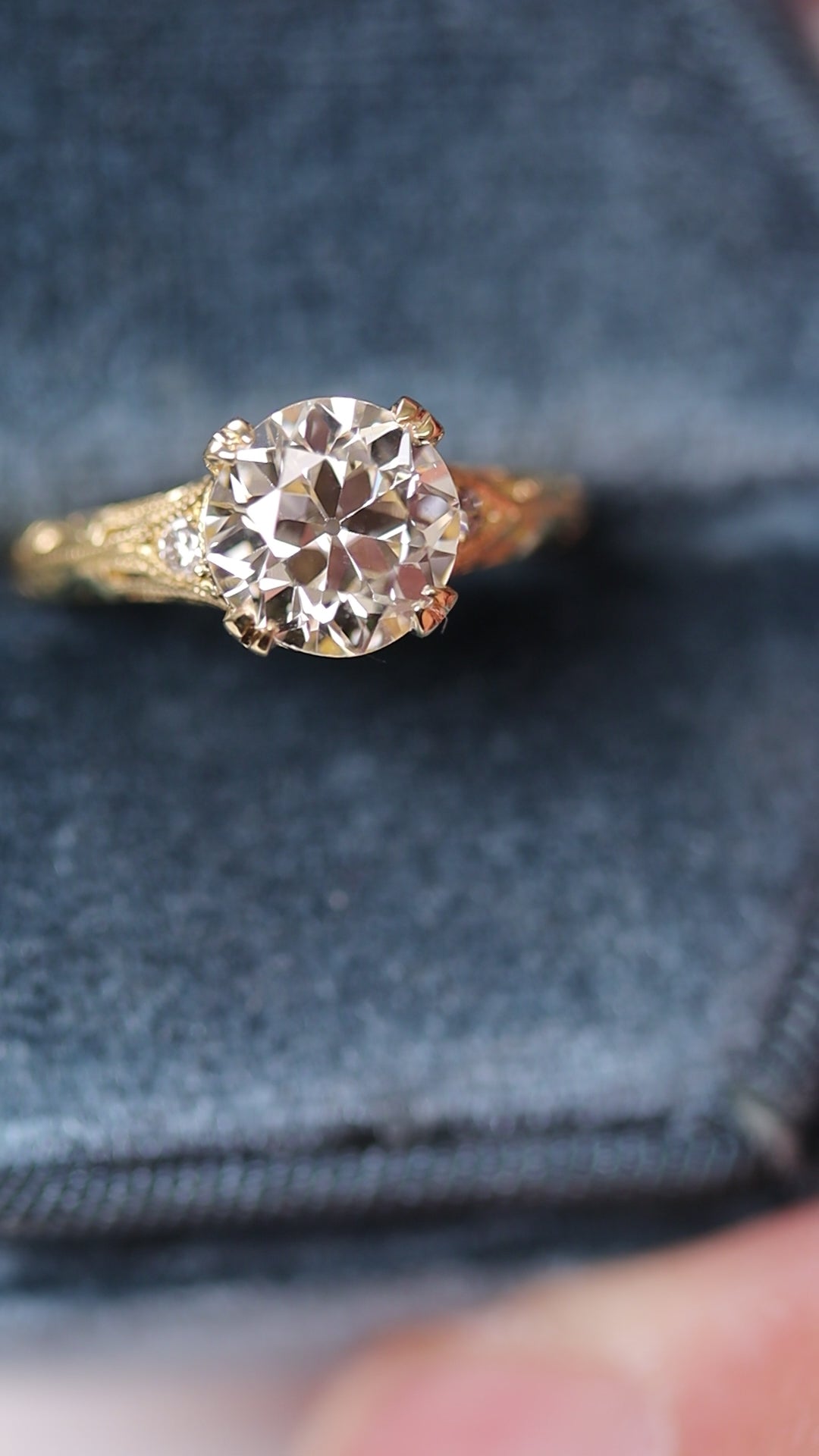 This luxe engagement ring is an exact reproduction of an antique original from our collection. A bright and sparkly 2.03 ct Old European cut lab grown diamond sits down into the ring, fastened by double eagle talon style prongs. A beautiful open gallery with filigree metalwork allows for light to penetrate and give the diamond even more brilliance. Two small round brilliant cut diamonds are set into this beautifully hand engraved ring 14k yellow gold ring, for an added element of luxury. The diamond is D in color and VVS2 clarity with a certificate from IGI (L3257LG). Made locally by highly skilled craftsmen. Currently a size 6.25 and some resizing is possible.