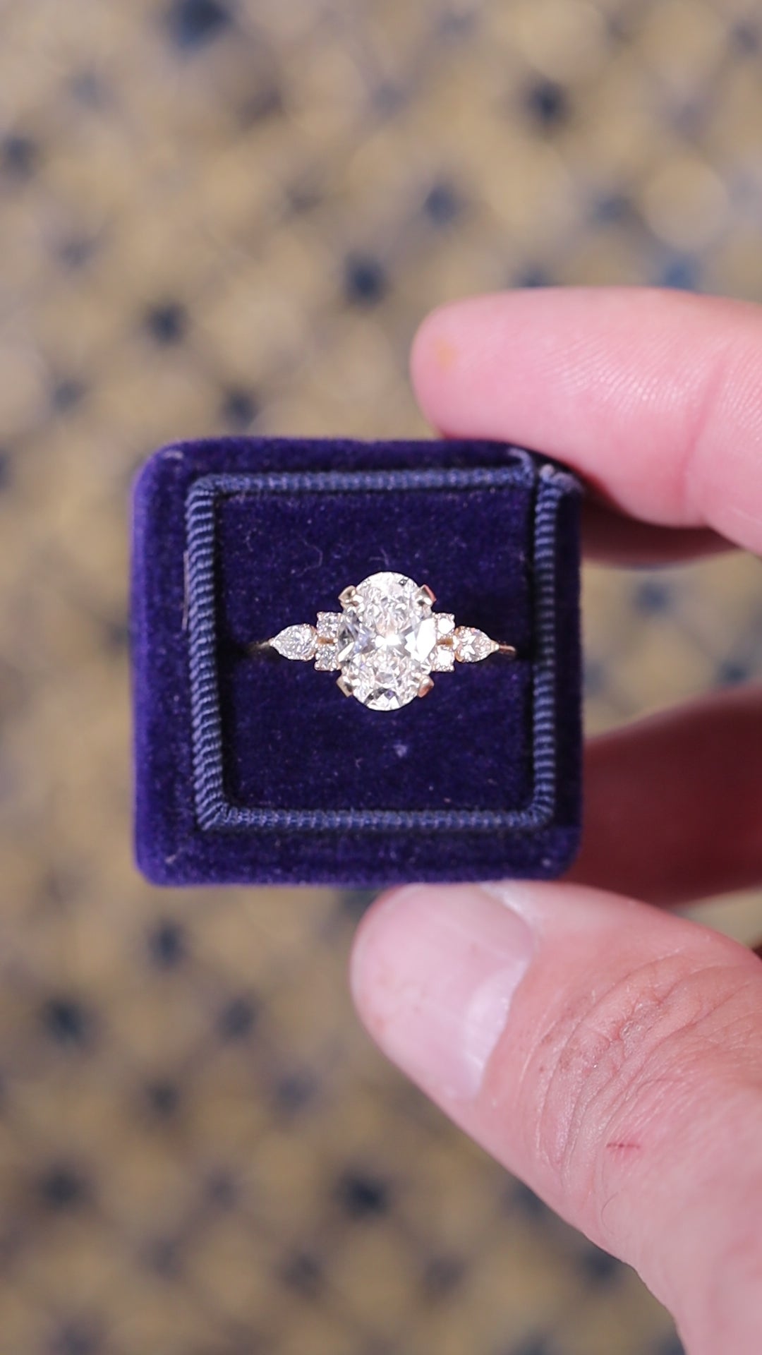 This vintage inspired engagement ring features a beautifully cut 2.10 ct Oval Brilliant cut lab grown diamond, in E color and VS1 clarity with IGI report #LG39510466. The ring sits nice and low on the hand, with the principal stone set with eagle talon prongs. The elegant setting which is reminiscent of early 20th C. jewelry design, has four round brilliant cut diamonds and two pear-shaped diamonds adding .33 carats total weight, F color and VS clarity set on the shoulders. The side stones are set in individual Edwardian-style crowns. This ring was inspired by an Edwardian era original. 14k yellow gold. Size 6 and can be resized.