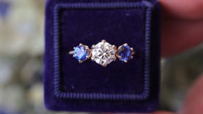 This gorgeous trilogy three stone ring is an exact replica of a late Edwardian original. The center stone is set with six prongs and is a round brilliant cut lab grown diamond .91 carats E color and VS1 clarity with an Ideal cut grade. The two matching cornflower blue mined sapphire side stones, also in six prong crowns, weigh .71 carats total and are E-F color and VS clarity. The simple, skinny rounded band is 1.6mm wide and currently size 6 1/4. 14k yellow gold. This ring is also available in different metal, diamond and gemstone options.