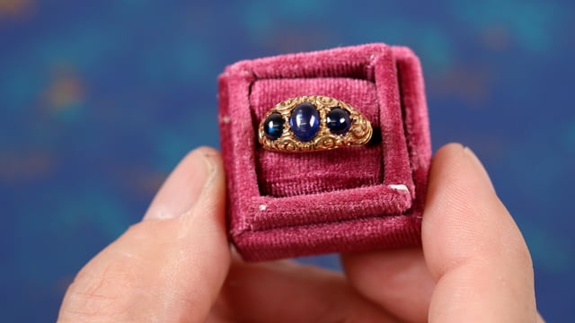 This stunning Victorian ring has three cabochon sapphires weighing 2 3/4 carats total weight. Set flush in a hand engraved ring with deep relief designs. The ring is 9.75mm at it's widest and tapers to 3.5mm wide at the bottom. Ring retains it's original inscription in Latin "vincit qui se vincit '93" which is a phrase by Publilius Syrus, a Latin writer who was a contemporary of Cicero's and flourished in the 1st Century BCE. It translates to "He Conquers Who Conquers Himself." It means that a person who overcomes his weaknesses or failings, and who is able to control his actions and emotions, wins life's most important battle. Very inspiring for four words.
