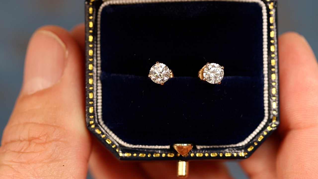 These stud earrings are timeless classics. The pair of lab grown round brilliant cut diamonds weigh 1.01 carats total and are D-E color and SI2 clarity. They are set in 14k yellow gold four prong settings with push backs.